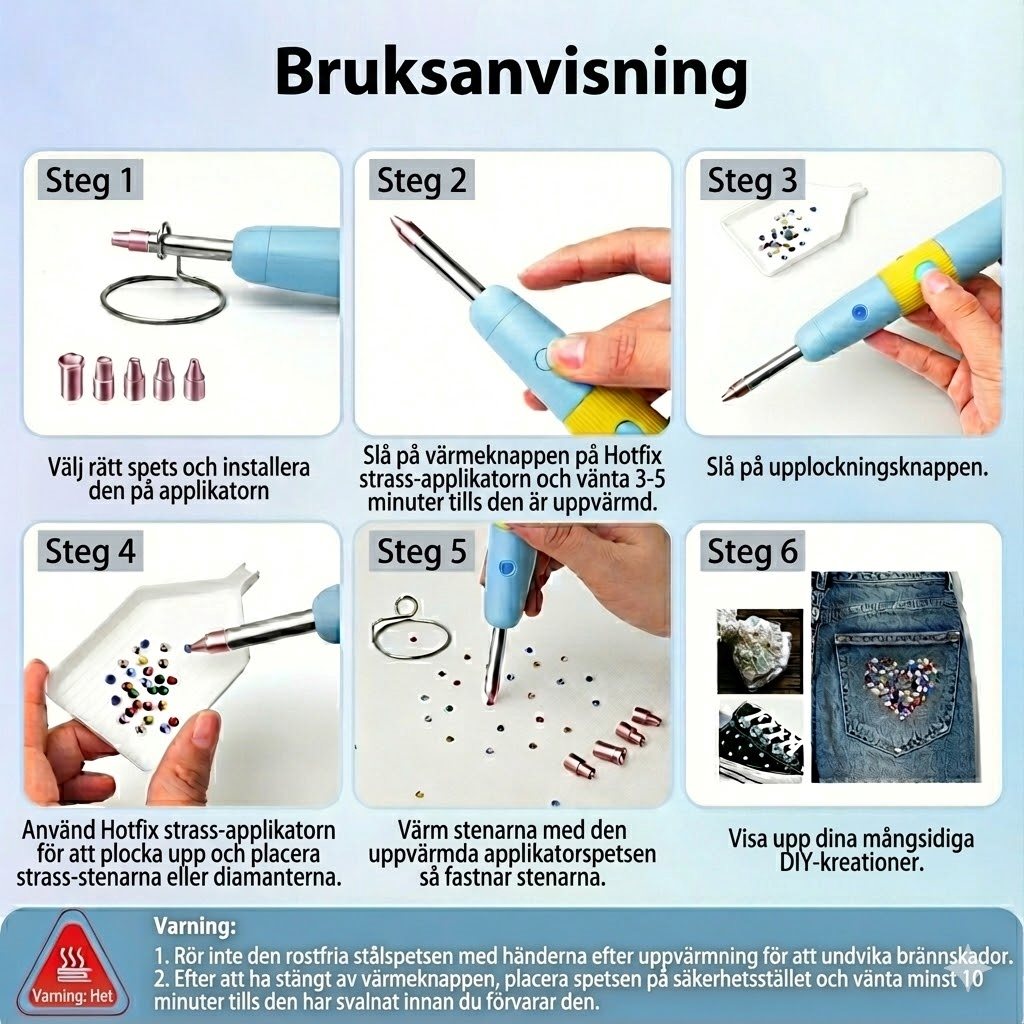 Med denna penna fäster du enkelt hotfix-strassstenar på kläder, accessoarer och DIY-projekt. Pennan fungerar med värme, vilket gör att limskiktet på undersidan av strassstenarna smälter och fäster stadigt på materialet. Perfekt för att personifiera kläder, väskor, skor och kreativa hobbyprojekt.