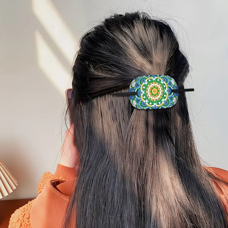Lägg till en färgglad detalj i din frisyr med dessa Diamond Painting Hårspännen – Set med 5! Varje hårspänne är tillverkat i slitstarkt PU-läder och pryds av ett vackert mandalamönster. Den medföljande träpinnen träs enkelt genom spännet för att fästa håret på ett stilfullt sätt.